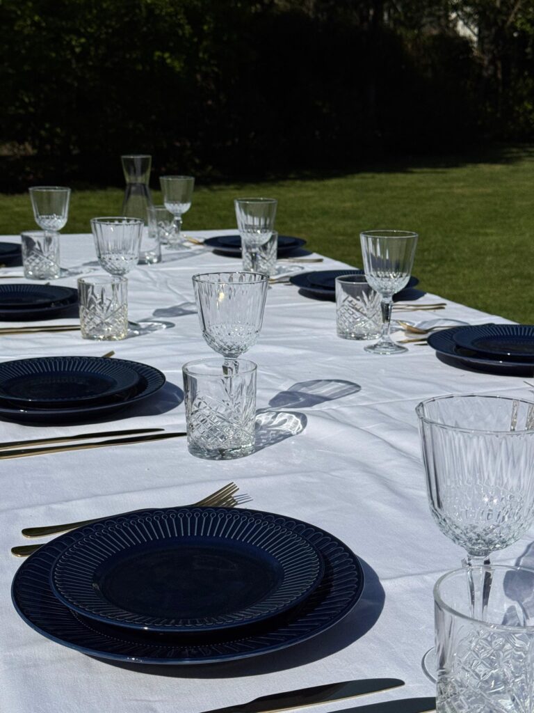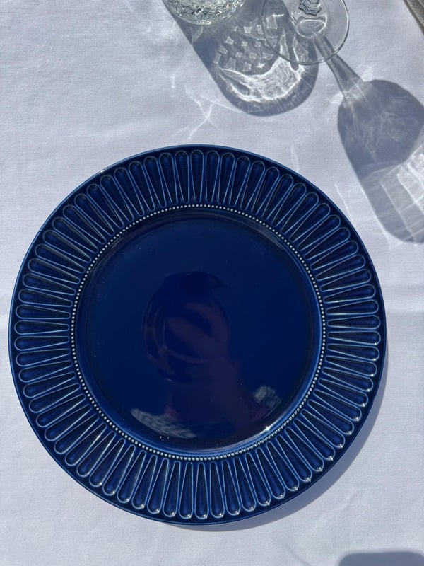 Het blauwe dinerbord groot deluxe is een stijlvol met een feestelijk randje. Aan de rand van het bord zit een reliĆ«f verwerkt. Samen met het blauwe dinerbord klein deluxe vormt dit een mooie set voor verschillende thema’s.